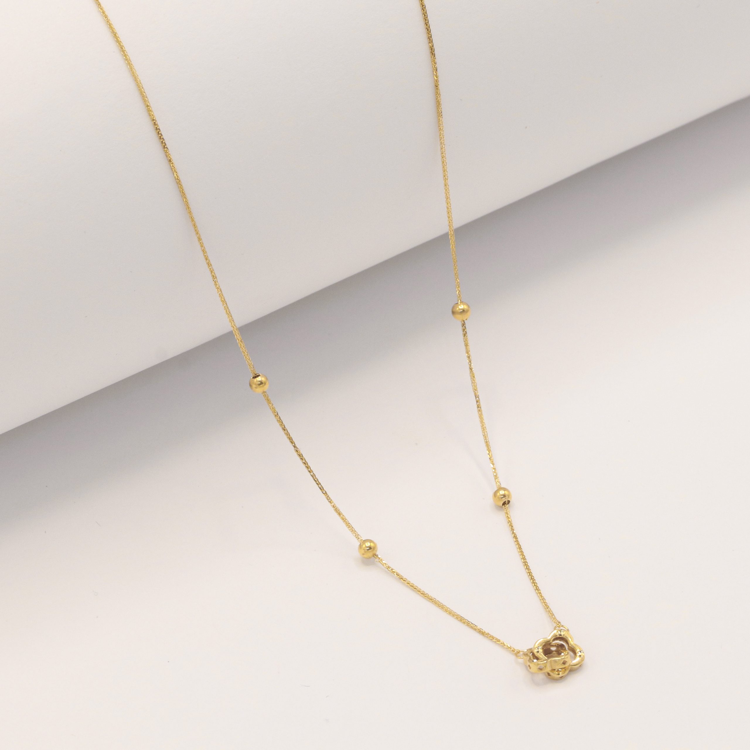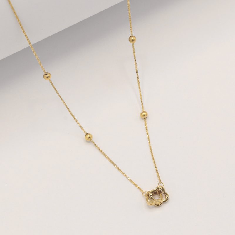 گردنبند مینیمال فیورا Fiora کد 20128 با طراحی الهامگرفته از ونکلیف. آویز مرکزی با فرم گلمانند و ظریف، در ترکیب با مهرههای طلایی روی زنجیر، جلوهای مینیمال و شیک ایجاد کرده است. این گردنبند انتخابی لوکس و متفاوت برای بانوانی است که سادگی و اصالت را در کنار درخشش طلا میپسندند.