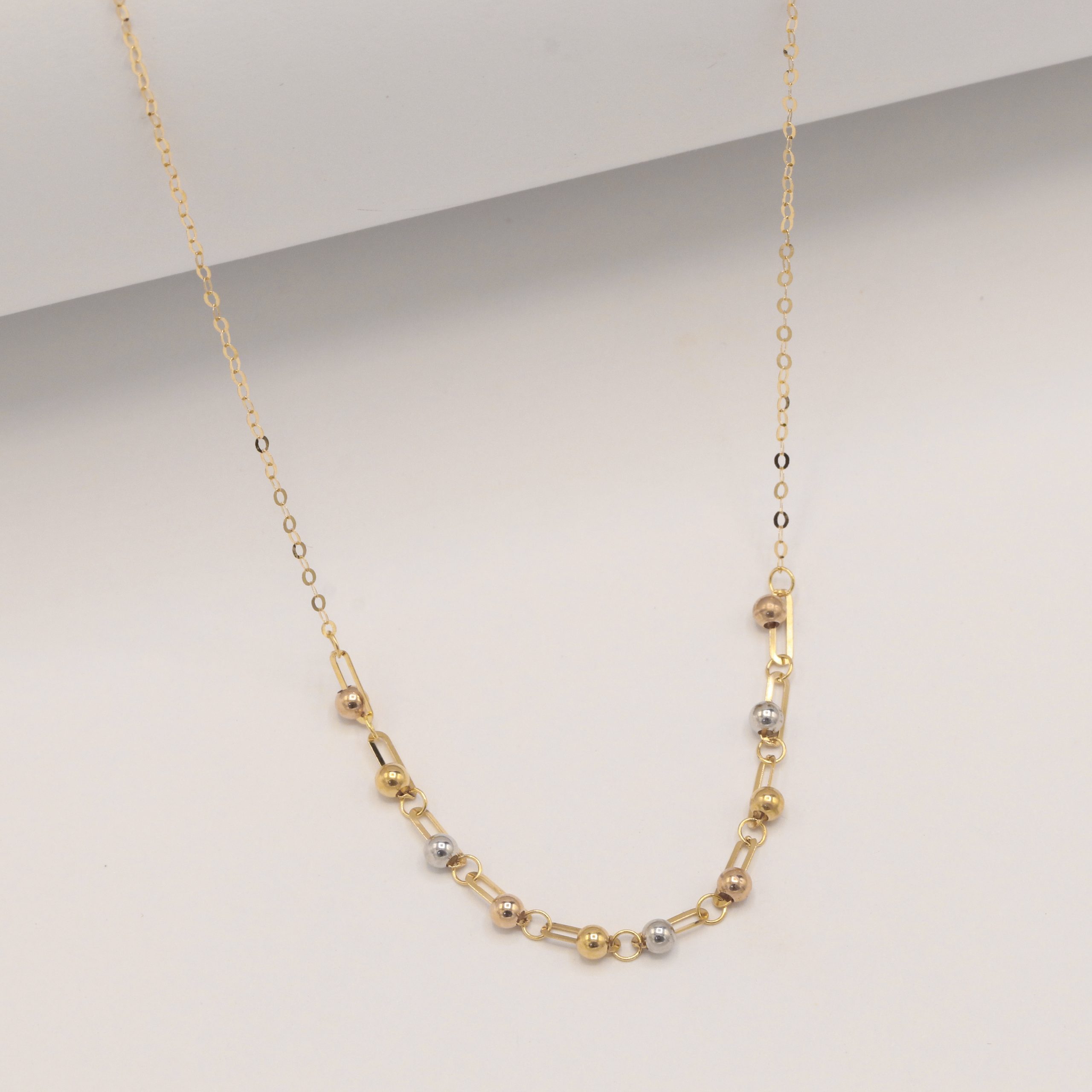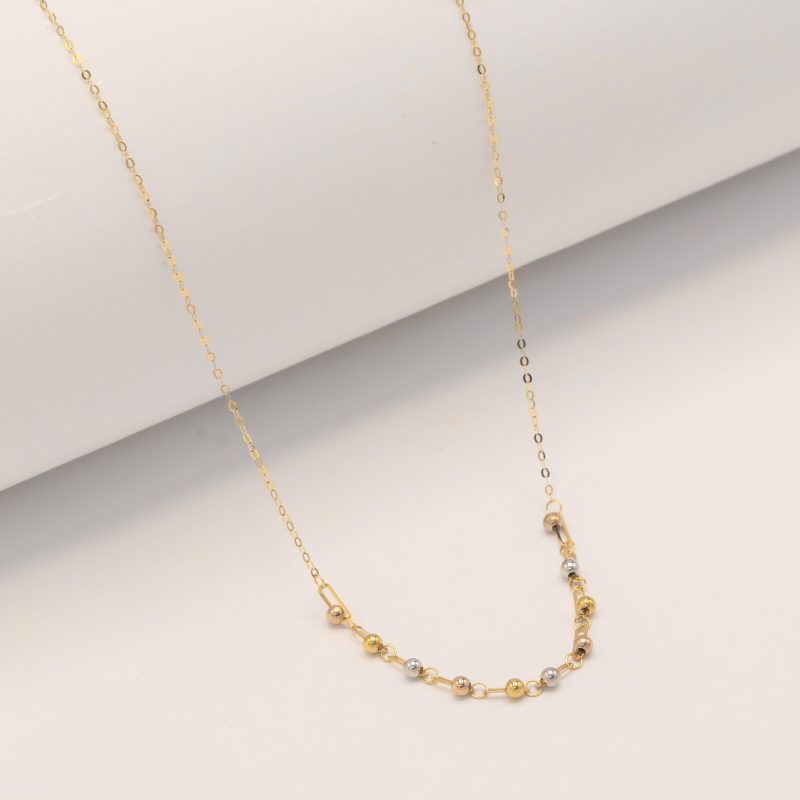 گردنبند مینیمال ونسا Vanessa کد 20126 ،طلای سهرنگ، با طراحی مدرن و بازی خلاقانهی گوی ها ، ترکیبی چشمنواز و خاص را به نمایش میگذارد. ترکیب طلاهای زرد، سفید و رزگلد بر روی زنجیر حلقهای، جلوهای متفاوت ایجاد کرده که هم شیک و ظریف است و هم پر از جزئیات خاص. این گردنبند سبک و راحت، انتخابی عالی برای کسانی است که به دنبال طلاهای مدرن و همیشهبهروز هستند.