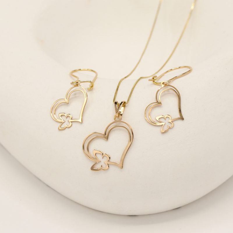 نیمست پریا Priya کد 80183 شامل یک گردنبند و یک جفت گوشواره از جنس طلا با طراحی ظریف و زیبا است. شکل قلب که با یک پروانه کوچک تزئین شده، نمادی از عشق و آزادی را به نمایش میگذارد. طراحی باز و مینیمال آن با خطوط نرم و براق، جلوهای شیک و مدرن به این مجموعه بخشیده است.